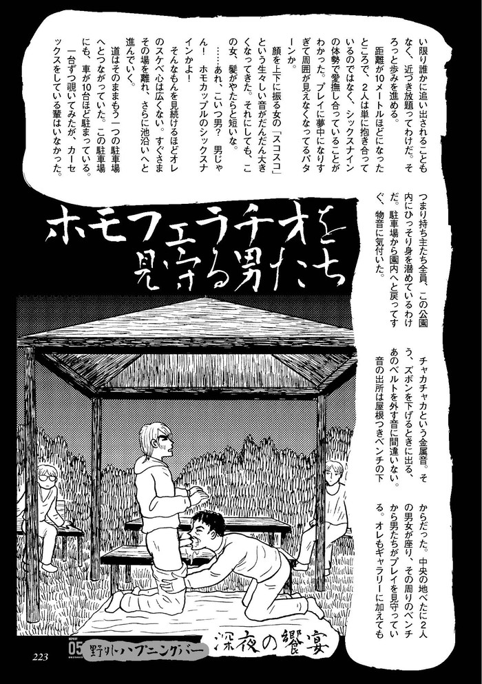 一台ずつ覗いてみたが、カーセックスをしている輩はいなかった。つまり持ち主たち全員、この公園内にひっそり身を潜めているわけだ。駐車場から園内へと戻ってすぐ、物音に気付いた。