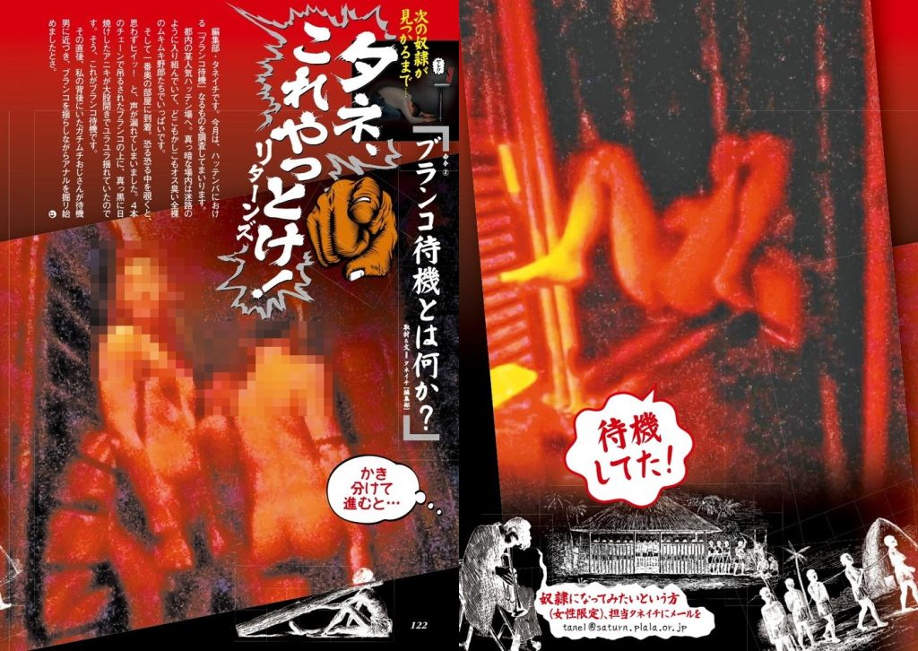 都内の某人気ハッテン場へ。真っ暗な場内は迷路のように入り組んでいて、どこもかしこもオス臭い全裸のムキムキ野郎たちでいっぱいです。そして奥の部屋に到着。恐る恐る中を覗く思わずヒイッ!と、声が漏れてしまいました。チェーンで吊るされたブランコの上に、真っ黒に 焼けしたアニキが大股開きでユラユラ揺れていたのです。そうこれがブランコ待機です。その直後、私の背後にいたガチムチおじさんが男に近づき、ブランコを揺らしながらアナルを掘りはじめました